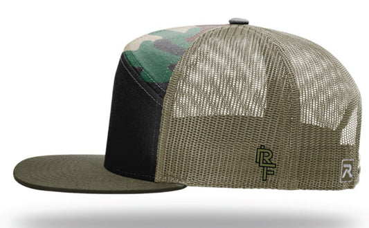 Richardson 168 7 Panel Trucker Cap with Rasta Logo- Black/Green Camo/Loden